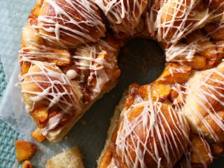 This peach pull-apart bread is a breakfast dream! Similar to monkey bread or bubble bread, the homemade brunch treat features soft and pillowy bread filled with sweet peaches and a delicious brown sugar-cinnamon coating. The pull-aparts make this peach monkey bread ideal for sharing. Serve warm with a drizzle of brown butter glaze!
