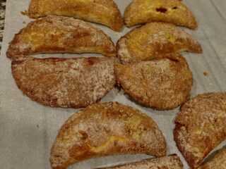 I used my own pie filling recipe using fresh peaches, but used your easy to follow crust recipe. It tastes good, it’s flakey, yet, holds together well, so you can easily pick up the turnovers & eat them. Great to package & share or serve to a group of people.